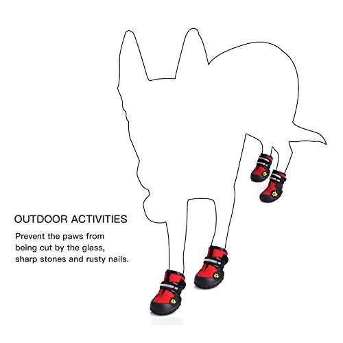 -. Feature : High Quality -- Made of tough, water resistant material, capable to keep debris out, and bring more comfort and cool to paws. / Waterproof and Anti-Slip -- Well provide traction and offer serious paw protection in wet and dry, hot and cold conditions. / Comfortable and portable -- Easy to put on with wide split seam top opening, firmly fastened by 2 long, adjustable, and reflective velcro straps, difficult to slip off, also make your dog safe at night. / Durable -- Cute pet paw embroidery, fashionable yet durable, soft and hand washable. Lightweight, soft and hand washable, practical for dogs or puppies in daily walks during spring, summer, and early fall. / Multi-size selection -- Measure paw width for best fit. If the paw is in-between two sizes, select the larger size. Size 4 is for 2.95" x 2.48"(L*W), Size 5 is for 3.15" x 2.63"(L*W), Size 6 is for 3.35" x 2.87"(L*W), Size 7 is for 3.74" x 3.03"(L*W), Size 8 is for 3.94" x 3.23"(L*W)