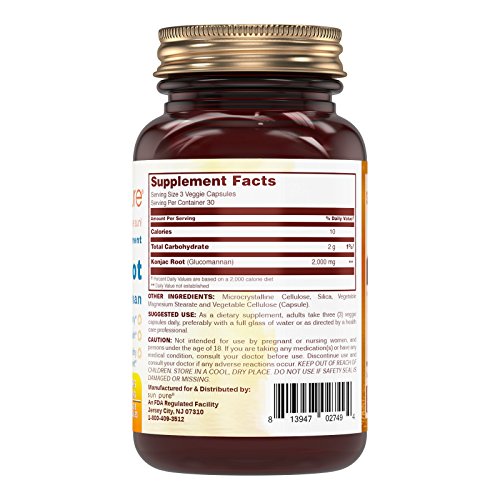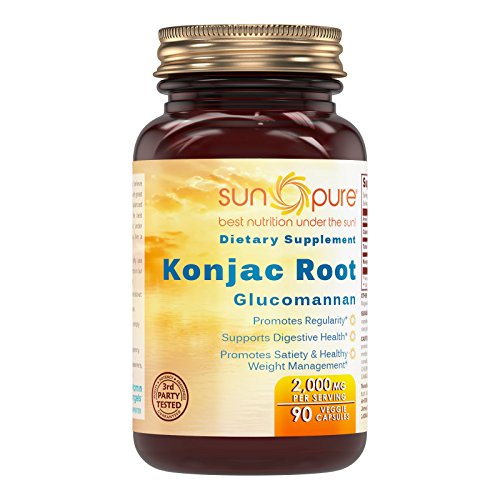 - 100% PURE & POTENT. With Sun Pure Konjac Root Veggie Capsules, you get only pure konjac root in every capsule. Each serving of 3 capsules provides 2000 milligrams of konjac