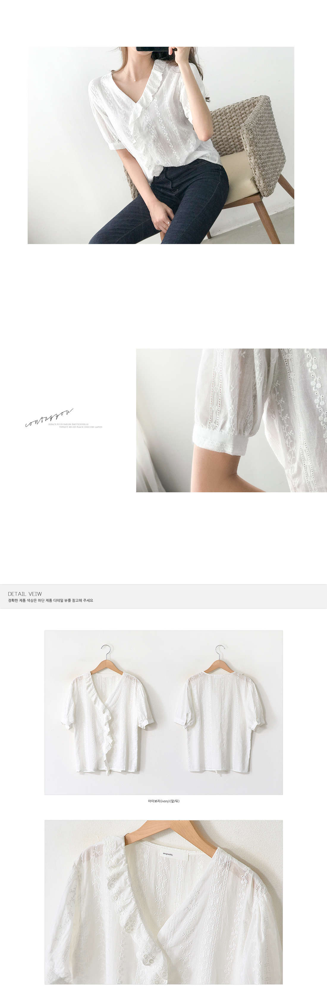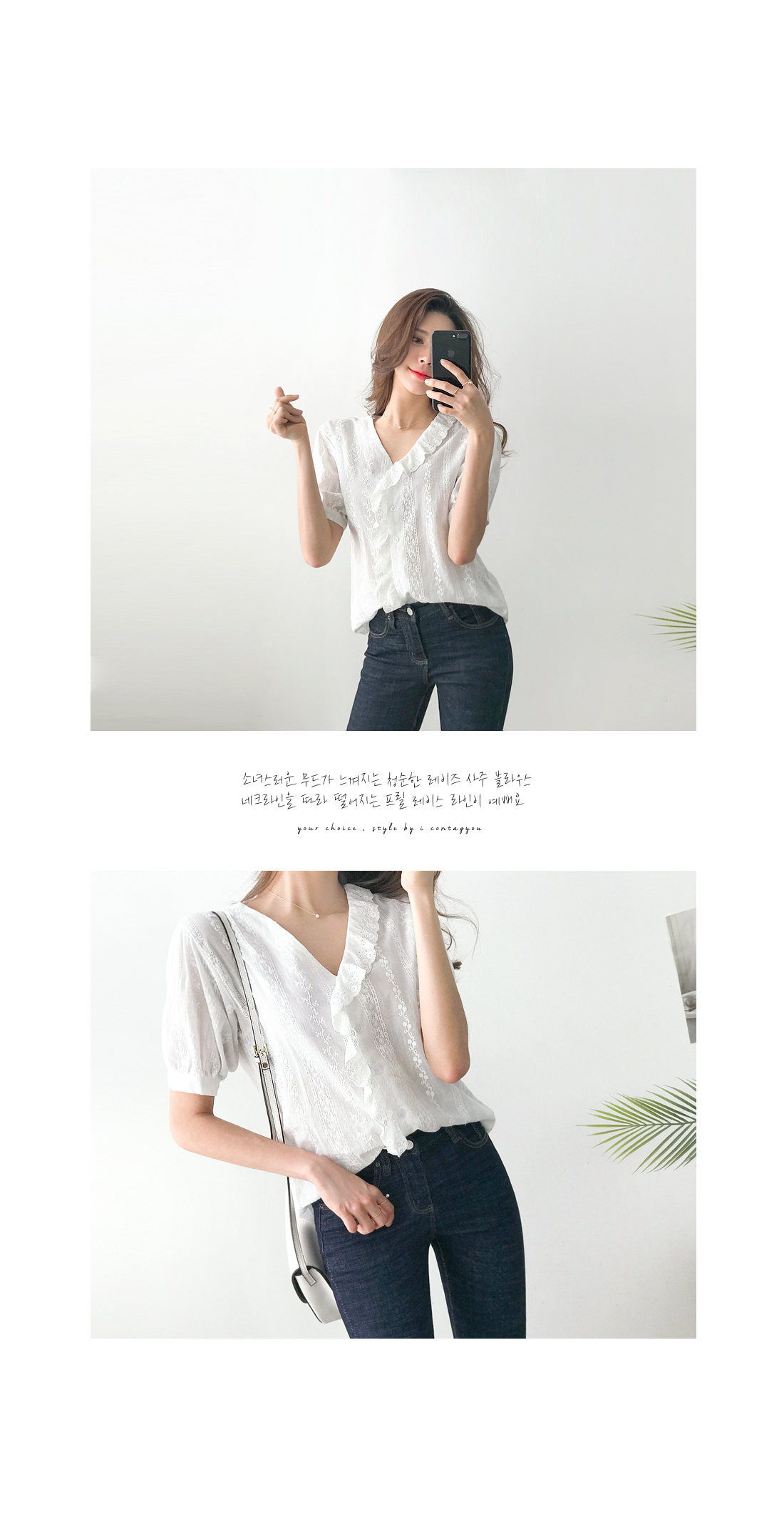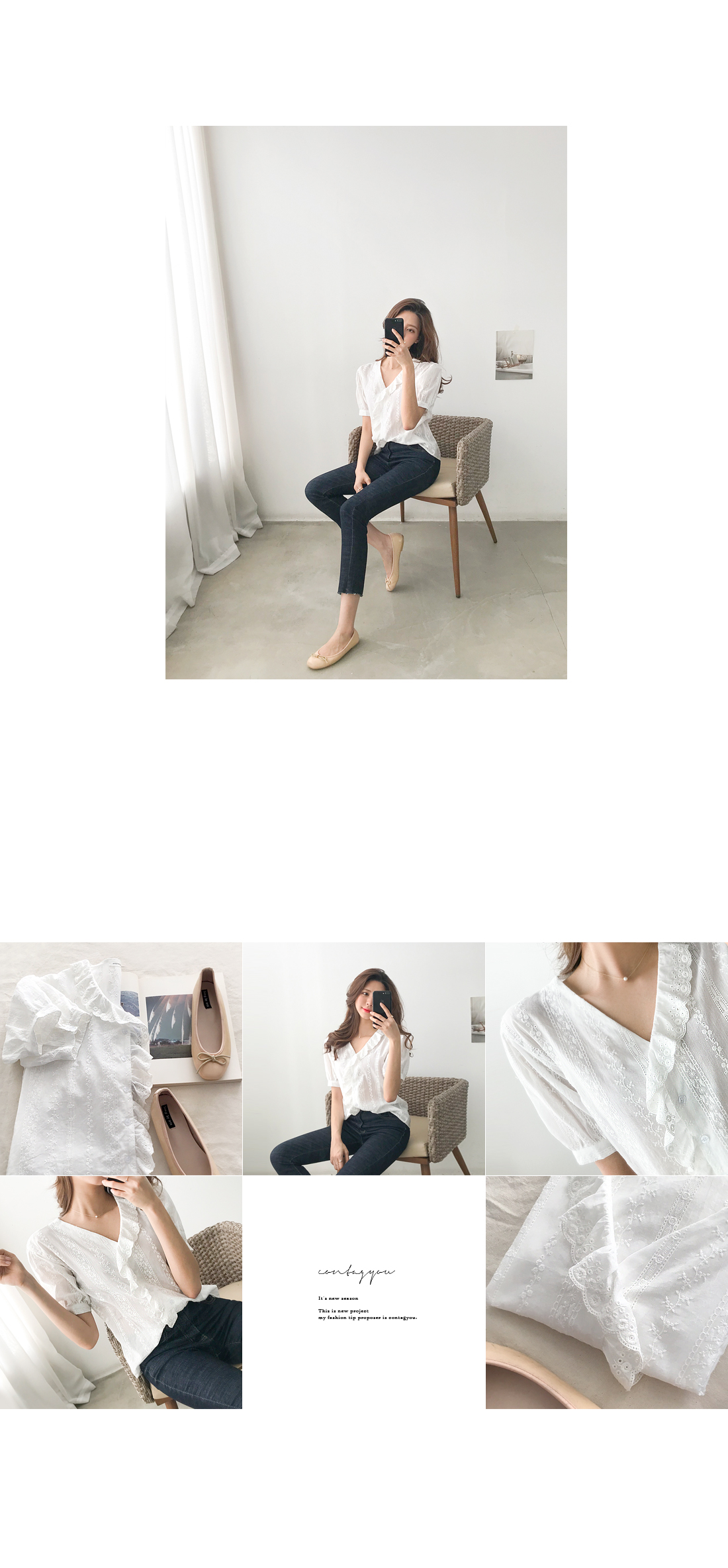 산뜻하고 가벼운 면소재로 제작되어 쾌적하고 기분좋은 피팅감으로 즐기실 수 있는 블라우스예요. 은은한 비침이 느껴지는 원단이지만 이너와 함께 어떻게 연출하느냐에 따라 색다른 느낌으로 청순한 분위기 를 연출해주는 블라우스예요. 숄더라인부터 이어진 레이스가 클로징 라인을 따라 프릴을 이루며 떨어져 사랑스러우며, 브이넥으로 연출되는 네크라인에 목선을 예쁘게 연출해준답니다. 소매라인은 가볍게 볼륨감 을 살려주는 퍼프로 사랑스러움을 한층 더해주었으며, 전체적으로 들 어간 자수레이스가 청순한 무드로 예쁜 포인트를 살려준답니다.