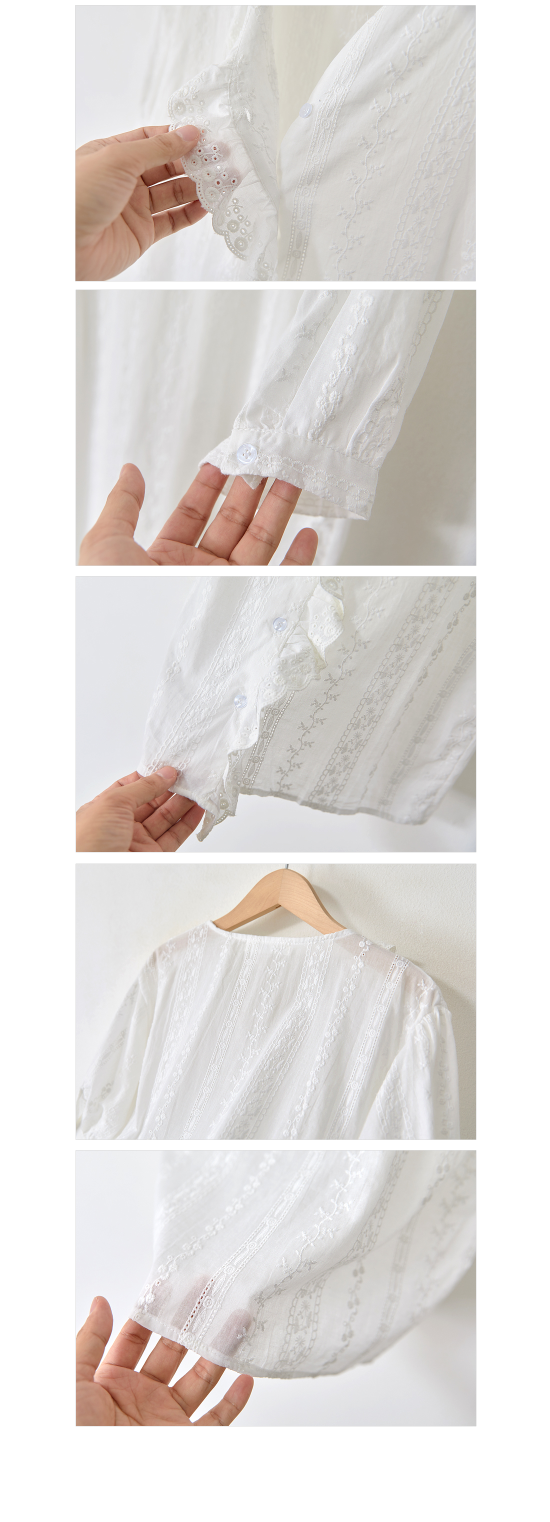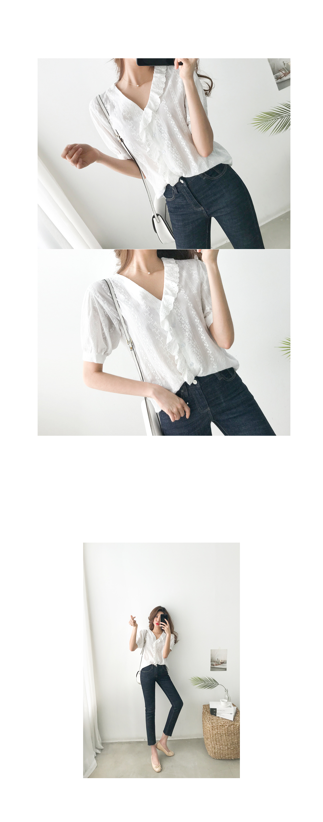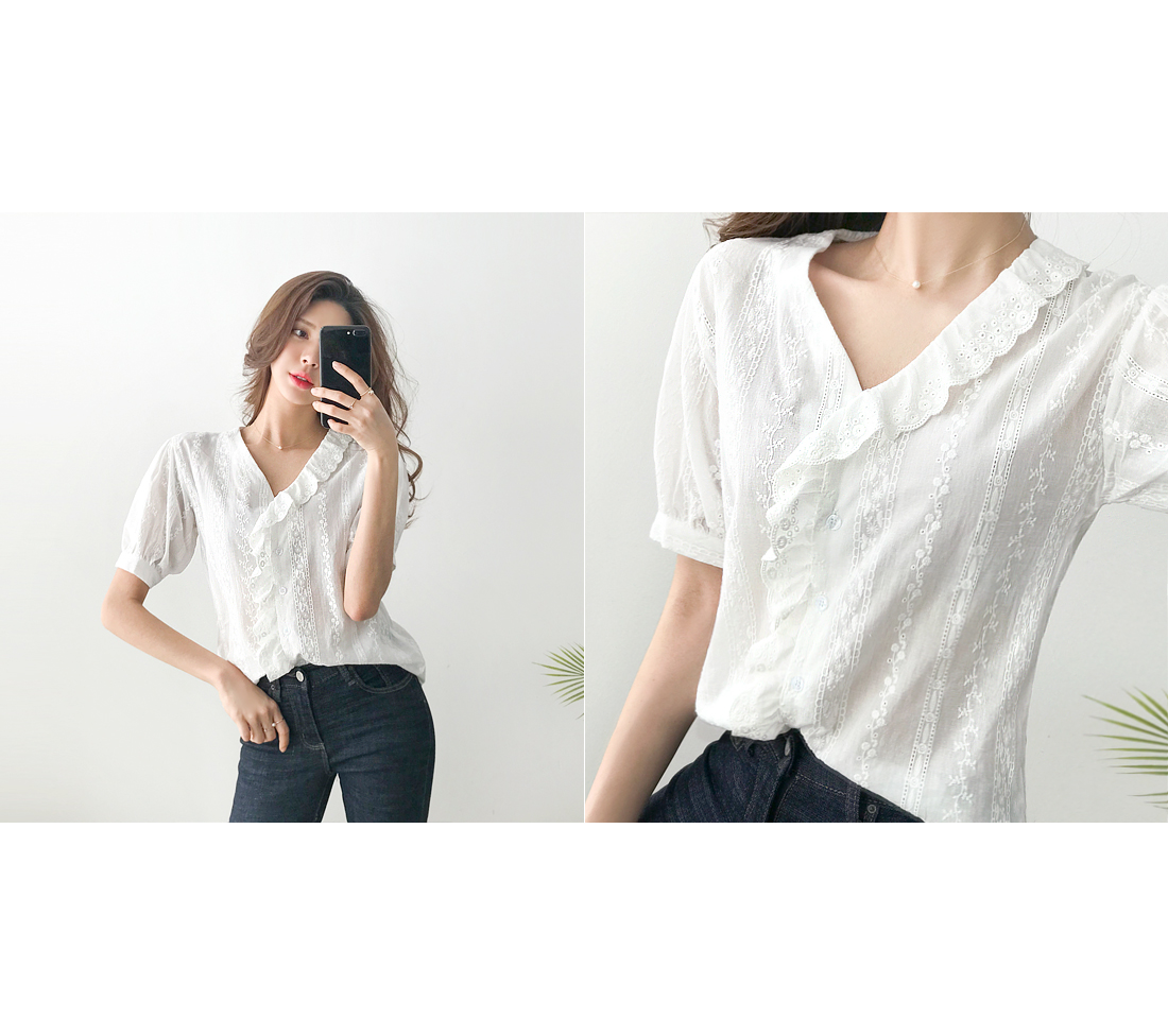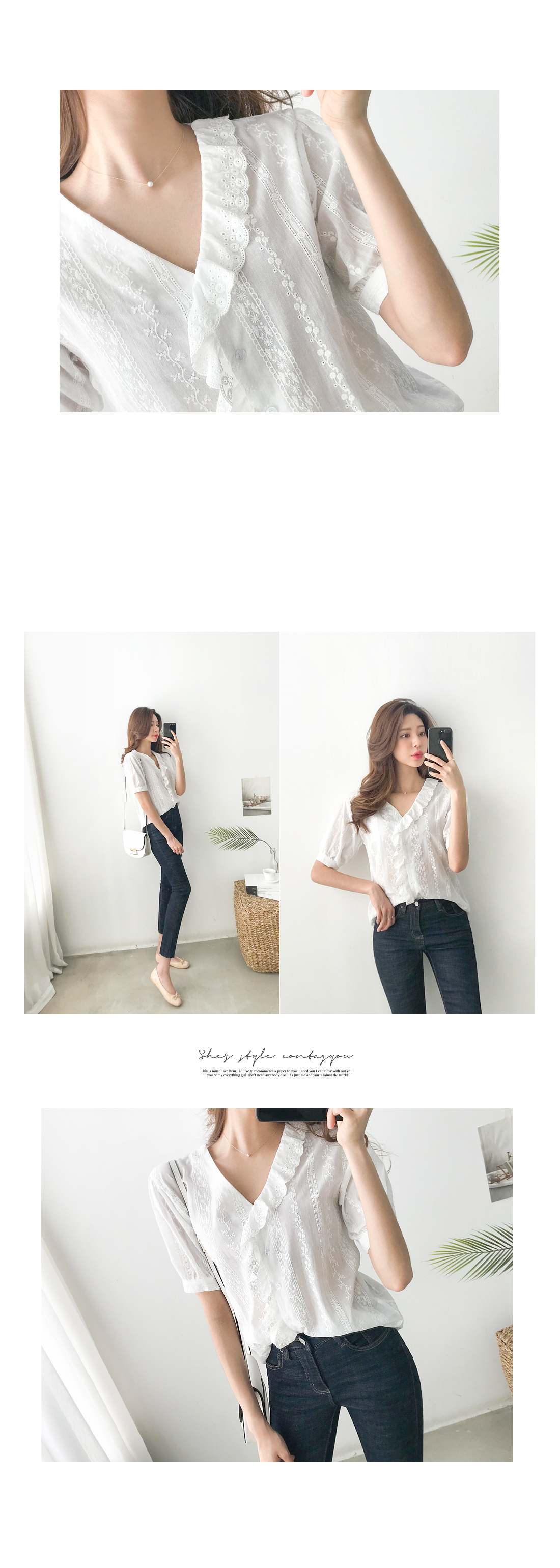 산뜻하고 가벼운 면소재로 제작되어 쾌적하고 기분좋은 피팅감으로 즐기실 수 있는 블라우스예요. 은은한 비침이 느껴지는 원단이지만 이너와 함께 어떻게 연출하느냐에 따라 색다른 느낌으로 청순한 분위기 를 연출해주는 블라우스예요. 숄더라인부터 이어진 레이스가 클로징 라인을 따라 프릴을 이루며 떨어져 사랑스러우며, 브이넥으로 연출되는 네크라인에 목선을 예쁘게 연출해준답니다. 소매라인은 가볍게 볼륨감 을 살려주는 퍼프로 사랑스러움을 한층 더해주었으며, 전체적으로 들 어간 자수레이스가 청순한 무드로 예쁜 포인트를 살려준답니다.