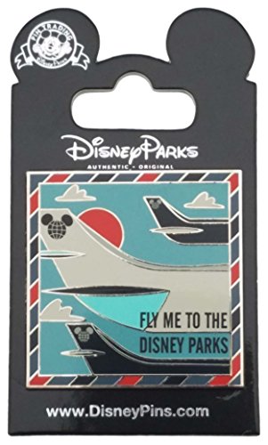 - This square pin depicts 3 jet/airplane tails with Mickey head globe icons on them flying in the sky with the sun and clouds with a blue gray, red and black pattern forming a border
