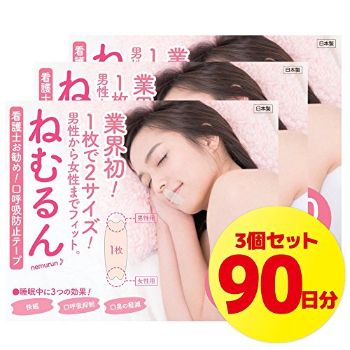 -. Feature : 大容量の 90日分(30枚入り×3) / 口呼吸防止テープねむるんは安心の日本製。医療現場で使用している特使シートを採用。 / 業界初!1枚で2サイズ(男性用、女性用)を実現! / 睡眠中に3つの効果。快眠&口呼吸抑制、口臭の軽減。 / いびき軽減グッズ、鼻呼吸促進、口閉じテープ、鼻呼吸口止めテープ、口呼吸防止テープ