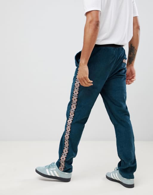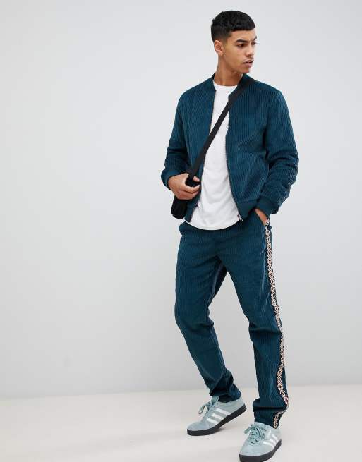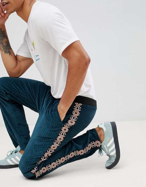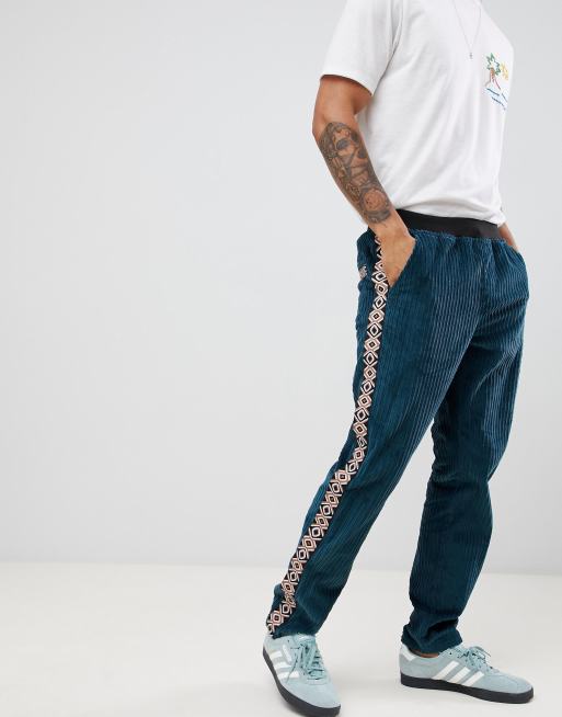 ASOS DESIGN two-piece slim pants in teal cord with geo-tribal side taping