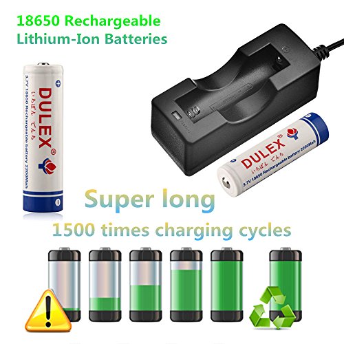 - LONG-LASTING: Up to 5 hours of powerful, non-diminishing brightness from the included premium rechargeable 2200mAh 18650 battery and Charger. LEDs boast an extended 50000-hour lifespan.