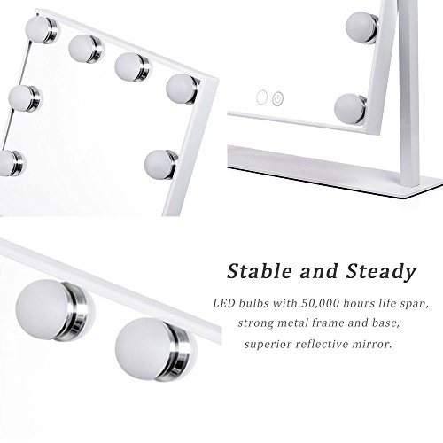 Sturdy Construction and High Quality LED Bulbs - Strong, solid feel with metal frame and base, built to withstand heavy use. Gorgeous and superior reflective mirror built to last with top quality material. Non-replaced LED bulbs with 50,000 hours life span; no need to replace the bulbs.