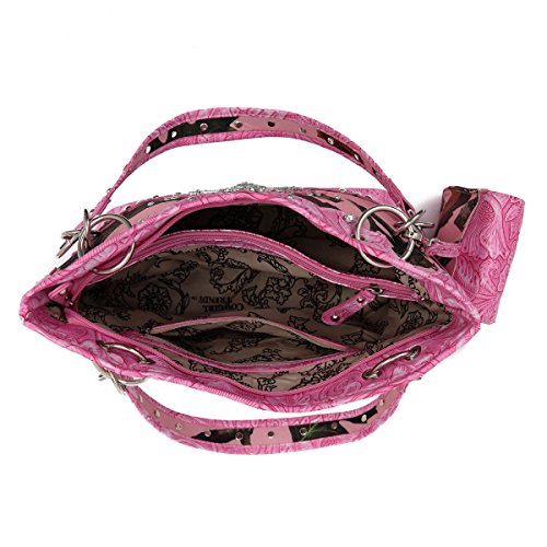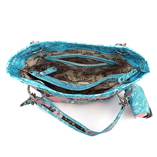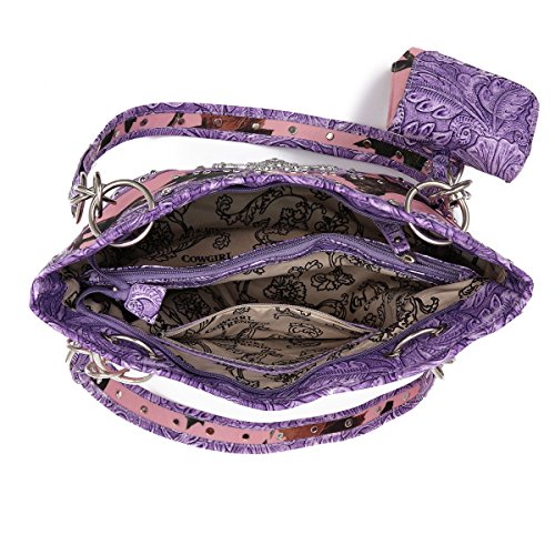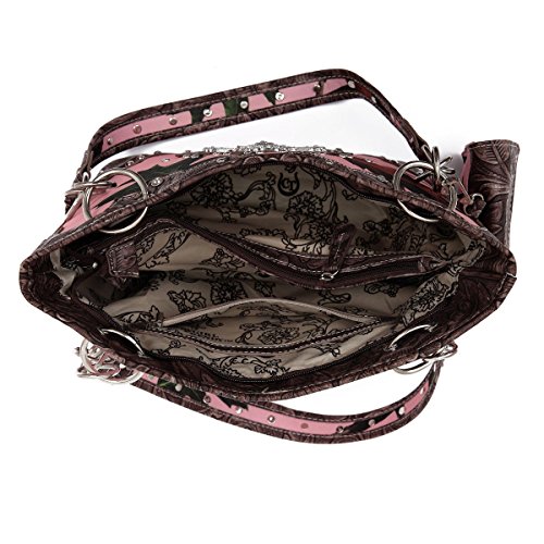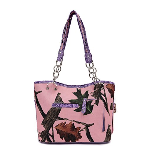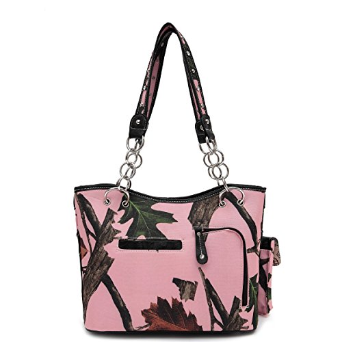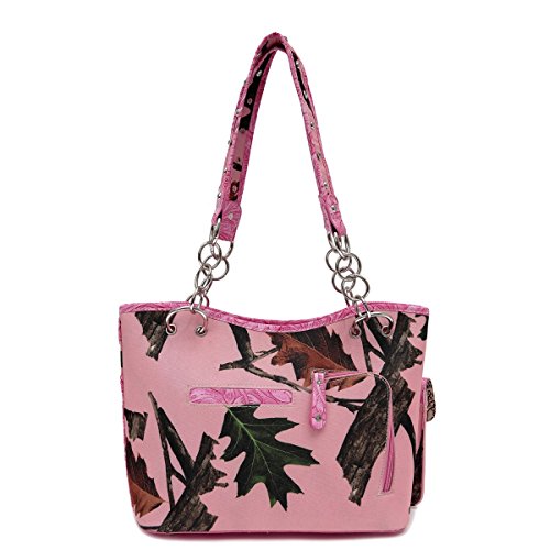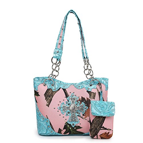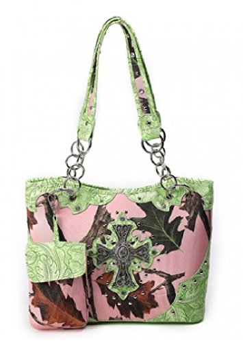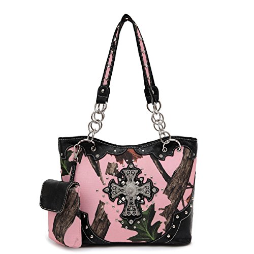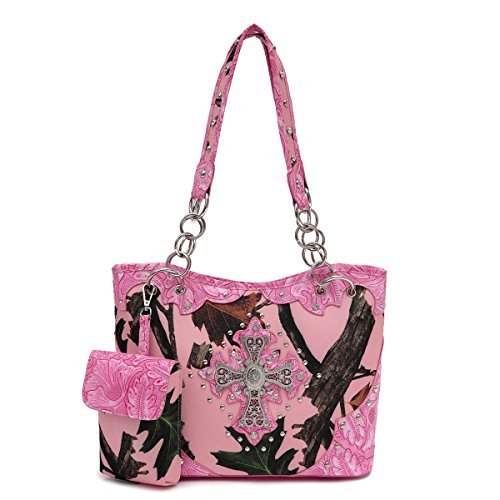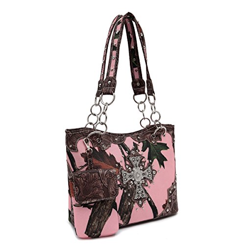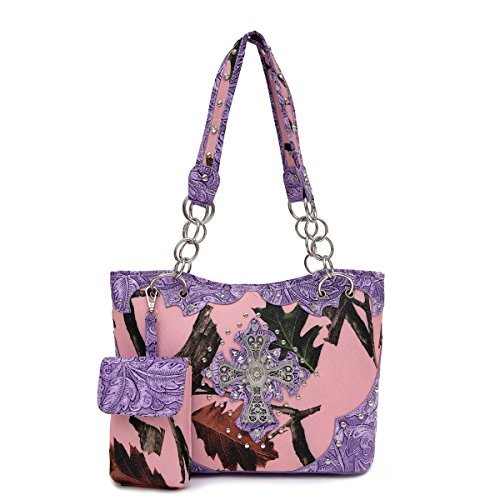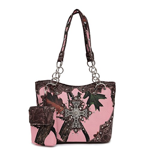 Product Description Express your western cowgirl with this stylish handbag purse. Very durable canvas material printed with Pink Camouflage forest leaves. The faux leather trim with embossed floral pattern highlights the beauty of this purse. The big rhinestone-covered cross in the center front is an eye catcher. Zippered top closure to secure your belongings. Split compartment interior has 2 zip pockets: the large zip pouch can store your wallet or make-up kits and another zip pocket on the back wall to keep your things organized. Conceal carry pocket at the back can also store a 5-inch smartphone and an open pocket right next to it. It comes with a matching detachable cellphone holder. Double handle with metal rings provides a 12.25-inch drop. Perfect for work, convenient for your shopping and night out with girlfriends. The bag measures 5.25"W x 9.5"H x 12.5"L; Detachable Cell Phone holder dimensions is 3.75" long x 0.75" wide x 6" tall; Slide pocket at the back is 5 inch tall x 4 inch wide; Conceal Carry Zippered pocket is 5 inch tall x 9 inch wide 0