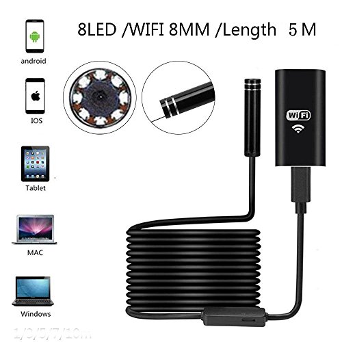 Wireless Endoscope, 8mm Digital Wifi USB Borescope Inspection Camera 2.0 Megapixels CMOS HD IP67 Waterproof Snake Camera with 8 Adjustable Led Light - 16.4ft 5M