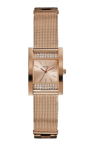 Rose-gold-tone stainless steel mesh bracelet Rectangular rose-gold-tone mixed metal case, 25x23mm, bezel embellished with crystal accents, stainless steel case back Rose-gold-tone dial with stick markers, three hands and logo Quartz movement Splash resistantFeature