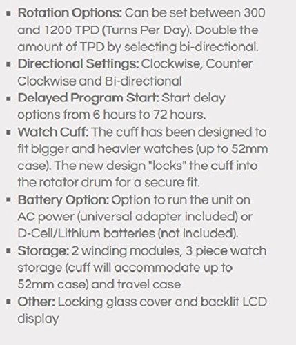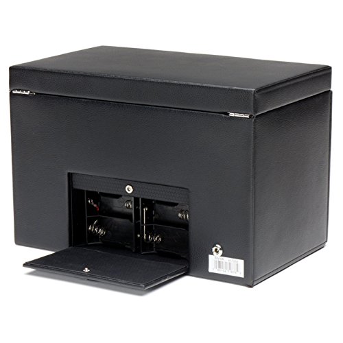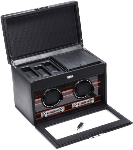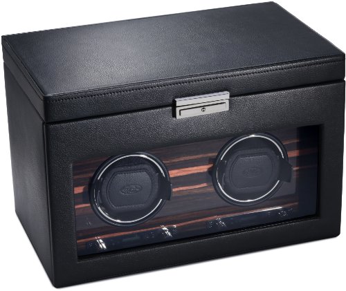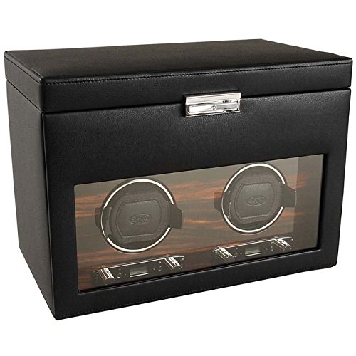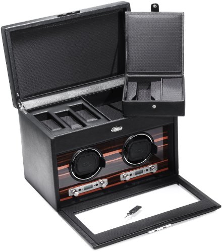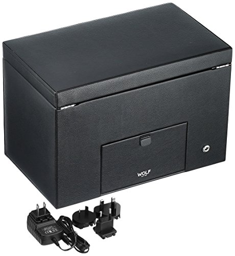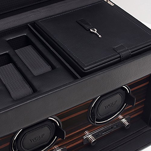 Studio : Wolf Designs Inc Publisher : Wolf Designs Inc Product Description Dimensions: 13W x 8D x 9H in.. 2 winder modules and 3-watch storage. Black faux-leather frame with wood veneer faceplate. Locking glass cover. Chrome-finished hardware and backlit LCD display. 0