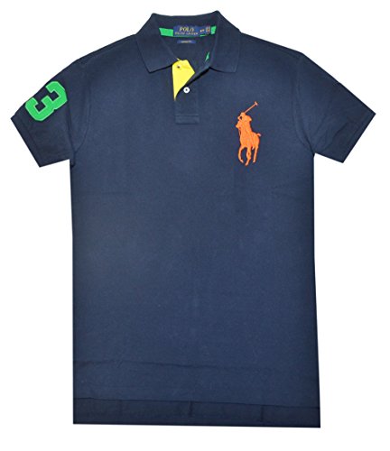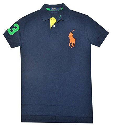 Polo Ralph Lauren Mens Big Pony Mesh Custom Fit Polo Shirt (Navy/Orange, X-Small)
