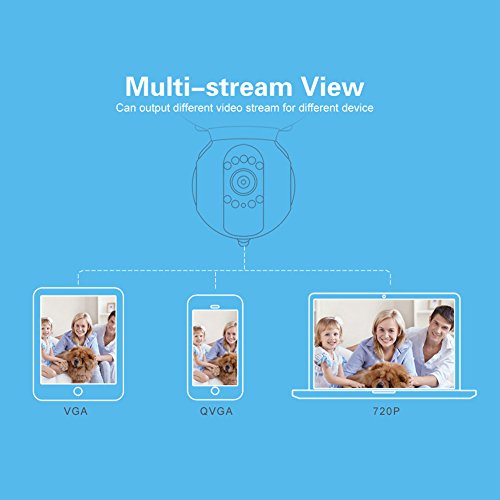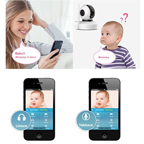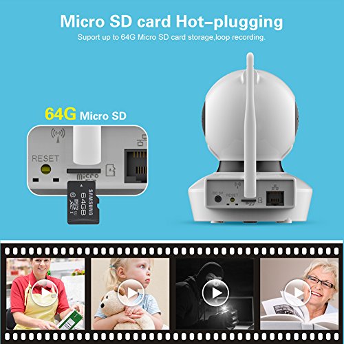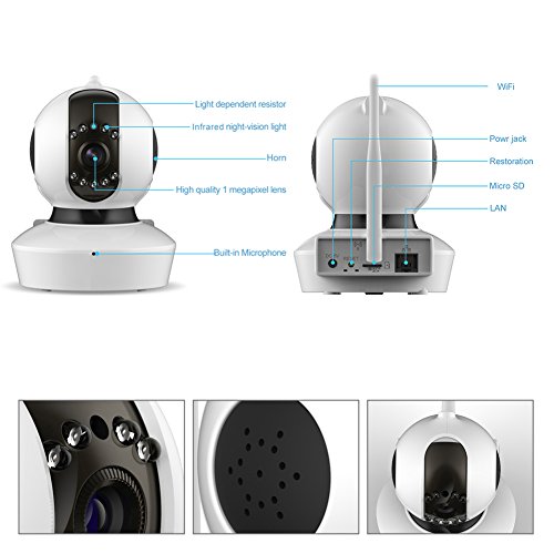 -. Feature : Super Clear IR Night Vision Up to 30 Feet - Advanced night vision with 9pcs 850nmΦ5mm LED beads extend the viewing distance to 30 feets in pitch dark with no light pollution, so your baby or pet will not be disturbed by LED glare. Dual IR-CUT filter auto switch, IR cut for capture love images, One million pixel high definition. / Excellent Full HD Video - 1280*720 Mega Pixels and high-tech optic lens give you a better quality picture and further vision. Real time camera or motion activated camera is expert in snapshotting moving objects. Typically used as Baby Monitor, Pet Monitor, Elderly Monitor, Home Security Monitor, Business surveillance and etc. / Two Way Audio - Built in - 48dB microphone and crystal audio output speaker(8Ω1W). Listen and talk with your baby,family at anytime/ anywhere. Support 4 live videos showed up on the same phone/ tablet screen, where you can watch over your baby / pets / elder / home in sharp real time video simultaneously. / Super Wide Viewing Angle, Remote Pan/Tilt - Romote Control Pan/Tilt: Pan 270°and Tilt 70°, remotely control the camera Pan & Tilt to monitor any angle. / Motion Detection & Alarm Action - Automatically detect moving objects and alarm action to your smart phone via E-mail and FTP. Support Onvif. Micro SD card (Built-in Micro SD Slot, Support 64G TF card, SD card is not included) for recording, storing and reviewing.