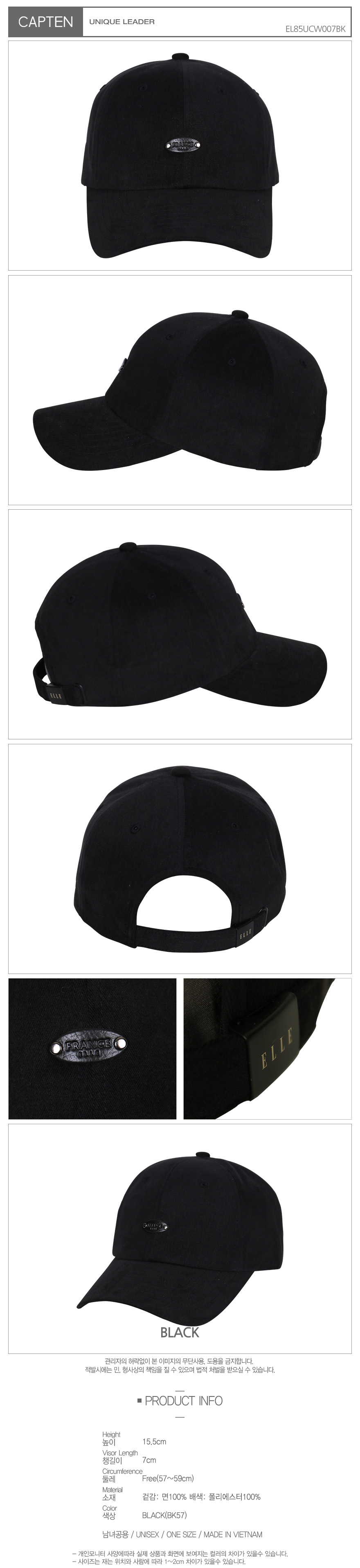 사이즈높이: 15.5cm, 챙길이: 7cm, 둘레: Free(57~59cm)