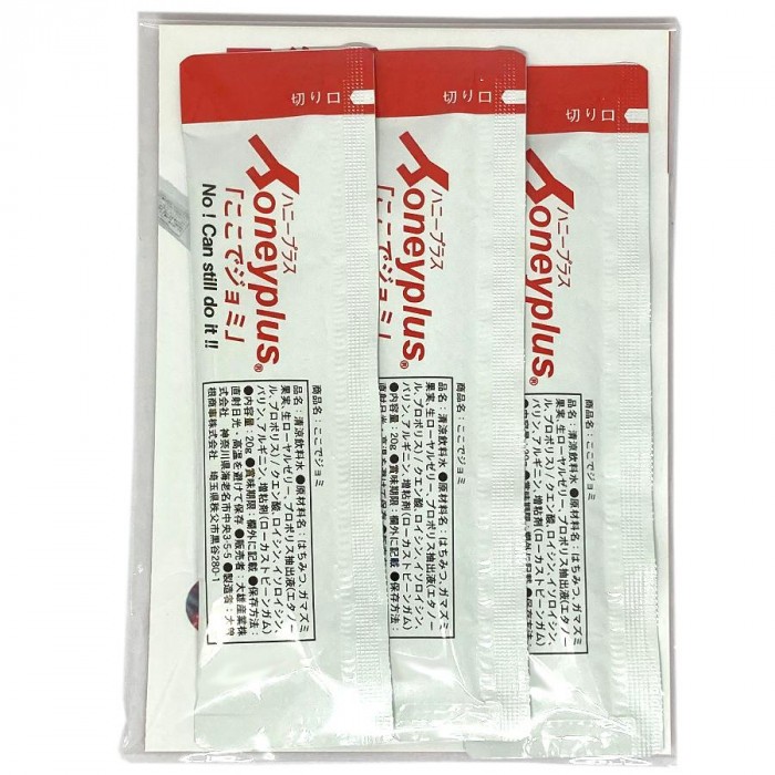 | 原材料 | 名称:清涼飲料水 カマヒハニー(ニュージーランド産)、ガマズミ果実(青森産)、生ローヤルゼリー(台湾産)、プロポリス(ブラジル産)、クエン酸、BCAA(ロイシン、バリン、イソロイシン)、アルギニン、増粘剤(ローカストビンガム) |