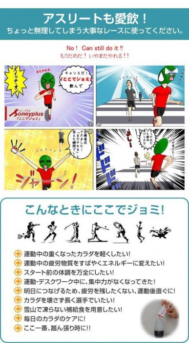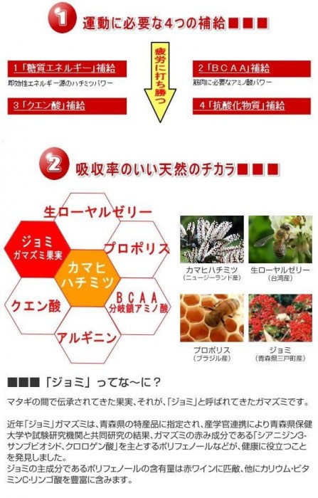 | 筋肉や体に必要な栄養素とエネルギーの両方を素早く補給するスポーツサプリ!ニュージーランド産カマヒハニーと「ジョミ」(ガマズミ果実)の恵み。天然成分のスーパー栄養バランス!アスリートからスポーツ愛好者、ウォーキングなどを楽しむ方のために! |