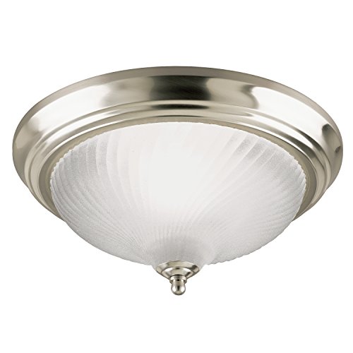 With an elegant brushed nickel finish and frosted swirl glass, this Westinghouse Three-Light Flush-Mount Interior Ceiling Fixture adds a tasteful touch to any decor. The shining, subtly carved base sets off the flowing, matte glass, which adds a fanciful edge to this fixture. A rounded finial provides a traditional touch. The fixture mounts flush, allowing it to work well with low and high ceilings alike. No matter where you place it, you will enjoy the sleek look of this fixture. The fixture's substantial size makes it ideal for larger living spaces. The fixture is 6-1/2 Inch high by 15 Inch in diameter. It uses three medium-base light bulbs, 60-watt maximum (not included). This Westinghouse interior fixture is Underwriters Laboratories listed for safety. It is backed by a five-year manufacturer's warranty against defects in materials and workmanship.Feature