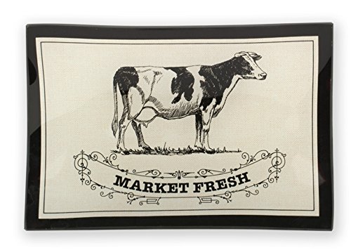 - Black and white tray features vintage-inspired image of a spotted cow; reads: market fresh