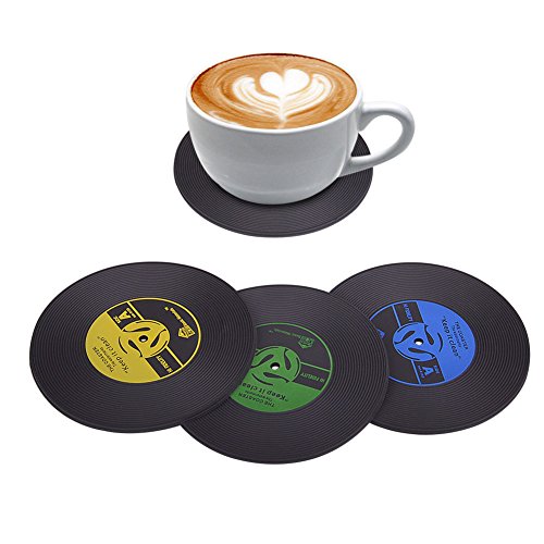 -. Feature : [MUSIC THEME] Adorn your coffee table with these stylish retro vinyl record coasters, making them perfect for music lovers / [PACK OF 10] Set of 10 pieces coasters can meet most of family needs. The 10 pieces has 4 color, it is 3 blue, 3 green, 2 yellow and 2 red. / [NON-TOXIC SOFT SILICONE] This coasters made of durable silicone, free to bend and environmental non-toxic. / [INSULATION AND NON-SLIP] Protects surfaces from hot and cold drinks, suitable for all cups, mugs and glasses of any beverage. the back of coasters has powerful adsorption capacity, with no-slip design, no worry about coasters moving. / [GROOVED DESIGN] This drink coasters grooved pattern holds liquid to prevent leaking.