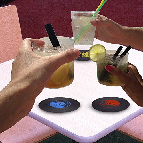 -. Title : Coasters for Drinks, Set of 10 Vintage Vinyl Record Retro Mats, Soft Rubber Cup Mat Drinks Absorbent for Wine Glass Tea Coffee Table Mug Beer Bottle Beverages, Silicone Drink Coasters, Large 4 inch