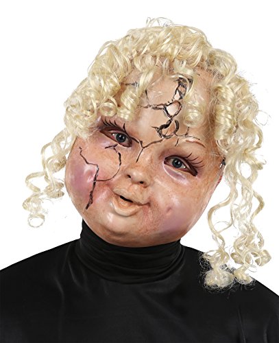 -. Feature : Creepy baby doll full-face mask with blonde synthetic hairat the front has an elastic strap and foam square at forehead for comfort / 100% PVC / One size fits most adults