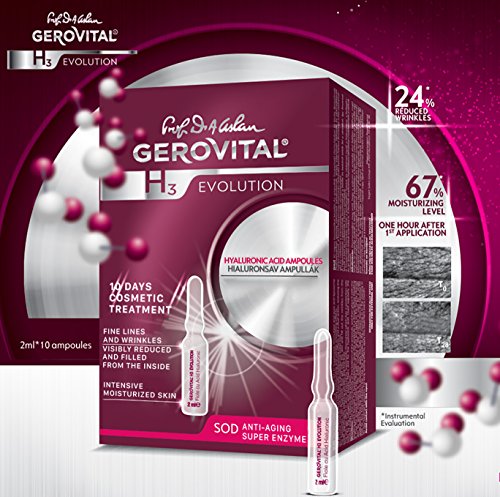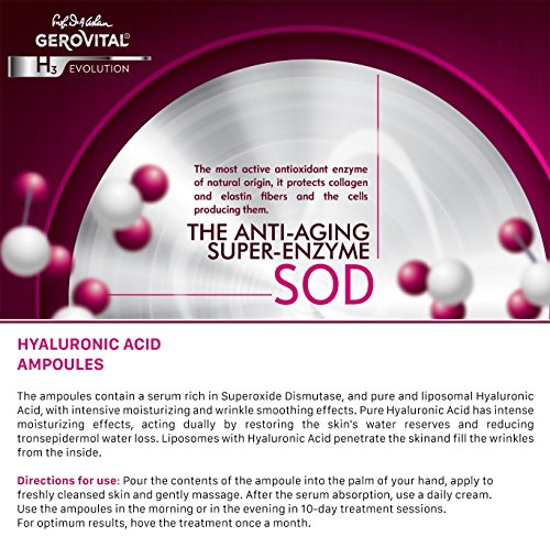 ADDRESSABILITY: Ampoules contain a serum rich in Hyaluronic Acid pure and liposomal, and Superoxide Dismutase, having effects of intense moisturizing and smoothing wrinkles. Pour the contents of one ampoule on palm and gently apply it on the freshly cleansed face. The Pure Hyaluronic Acid has intensely moisturizing effects and a dual action, restoring the skin's water reserves and reducing trans-epidermal water loss. The liposomes with Hyaluronic Acid get into the skin and fill out the wrinkles from the inside, significantly reducing wrinkles and fine lines. The anti-aging effect is also enhanced by Superoxide Dismutase which has a protection role both for collagen and elastin fibers and for the hyaluronic acid. Used regularly, this product visibly reduces wrinkles. ***DIRECTIONS: Get the serum entirely at the bottom of the ampoule, and then place it with the breaking point forward. For hand protection, wrap the ampoule in a tissue before breaking it. Pour the ampoule content into the palm of your hand and apply on the freshly cleaned skin by gently massaging it. The entire content of the ampoule is used for a single application! Once the serum is absorbed, apply the daily care cream from the Gerovital H3 Evolution line. Use the ampoules in the morning or in the evening in 10-day treatment sessions. For long-lasting effects, apply this treatment every month. Avoid contact with eyes! ONLY FOR EXTERNAL USE!*** BENEFITS: After 28 days of use: Reduces deep wrinkles depth by up to 24% *. Moisture level increased by up to 66.7% one hour after the first application *. * Instrumental AssessmentFeature