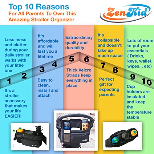 The latest innovation in luxury grade stroller accessories, the ZenKid Universal Stroller Organizer has a number of storage solutions packed into one compact organizer design. The stroller organizer includes: