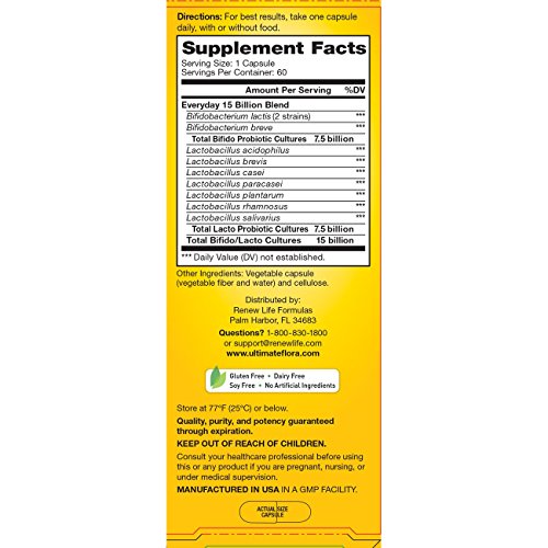 Ultimate Flora Everyday Probiotic 15 Billion is a high-potency formula with 10 scientifically studied Bifidobacterium and Lactobacillus strains. This daily probiotic supports digestive and immune health so you feel better, lighter, and more energized. These statements have not been evaluated by the Food and Drug Administration. This product is not intended to diagnose, treat, cure, or prevent any disease. * These statements have not been evaluated by the Food and Drug Administration. This product is not intended to diagnose, treat, cure, or prevent any disease.