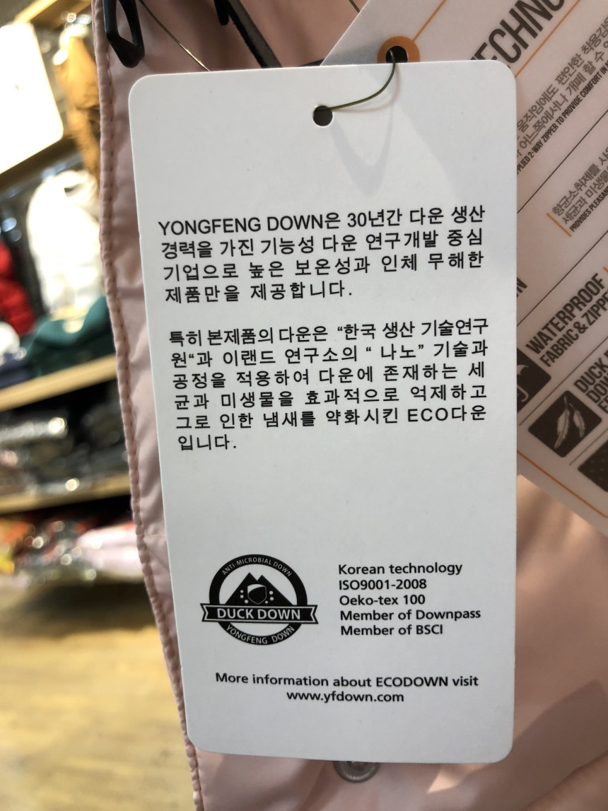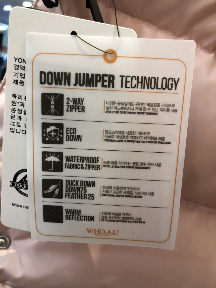 오리 솜털 75%, 오리 깃털 25% 함량으로 충전되어 있으며,
