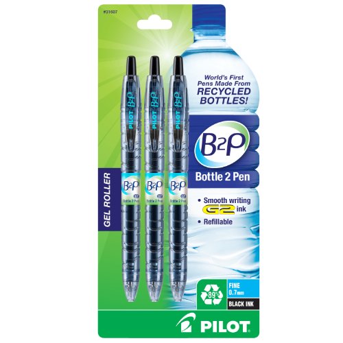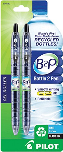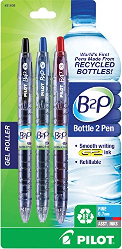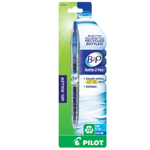 With the B2P, from Bottle 2 Pen Gel Roller, Pilot has launched the world's first pen made from recycled bottles! In recent years, plastic water bottles have been under close scrutiny for their environmentally unfriendly characteristics. Almost every hour, close to 250,000 plastic bottles enter landfills and comprise close to 50 percent of all recyclable waste. Mae from 89 percent post-consumer recycled plastic bottles, the Pilot B2P features vibrant gel ink and a fine 0.7mm point for smooth, effortless writing. Designed to mimic a bottle of water, the body of the B2P pen is translucent blue with unique striations like those commonly found on water bottles. Retractable and refillable, the B2P uses the same ink refill as the Pilot G2, America's number one selling gel pen. Available in blue, black, and red ink, the writing quality of the B2P meets the same high performance standards found in all of Pilot Pen's products. Pilot Pens. Simply write.