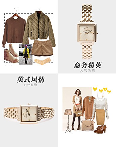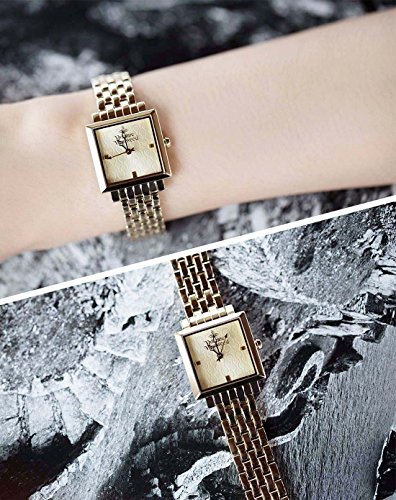 • Gold-tone watch featuring square case with textured dial, decorative hands, and logo at 12 o'clock