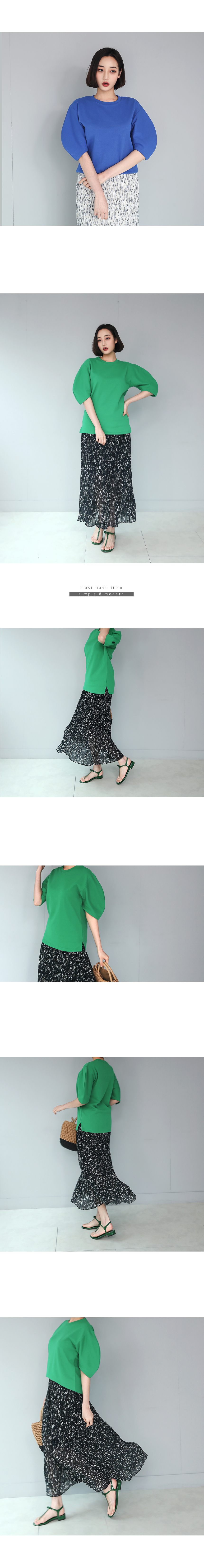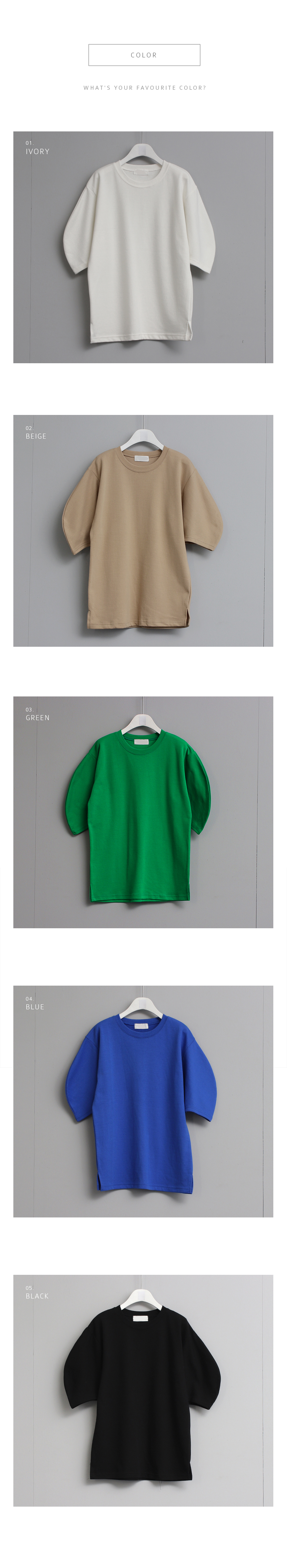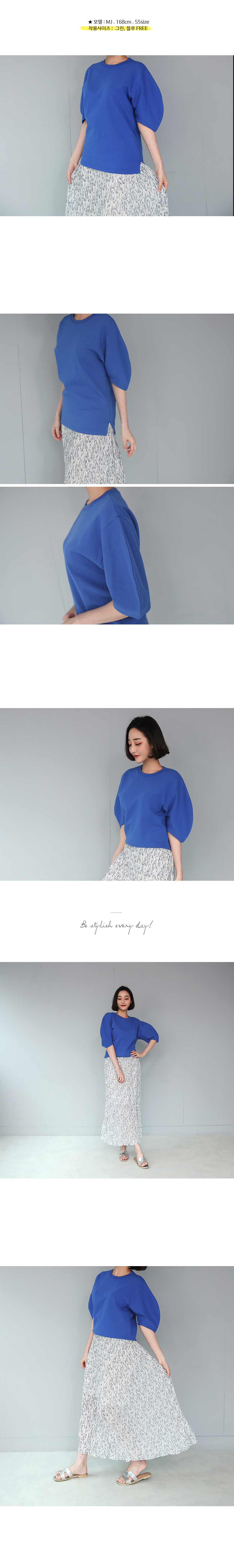 군더더기 없이 심플한 티셔츠로 둥글게 떨어지는 트렌디한 디자인의 소매가 포인트가 되어주는 아이템이랍니다