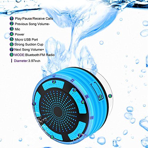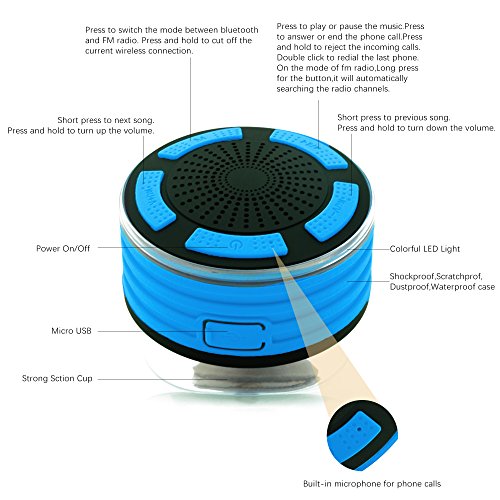 Unique Coloful Lights: Four colors LED lights varied when the speaker is on, creating a dynamic and romantic music ambience, excellent for party, dating and dancing time. As a beautiful shower speaker, it would be a wonderful Festival Gift for your beloved ones!