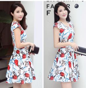花柄ワンピース リーフ柄ワンピース ボタニカル柄 フレアワンピース ノースリーブ 春夏 ミニ丈 ハイウエスト プチプラ