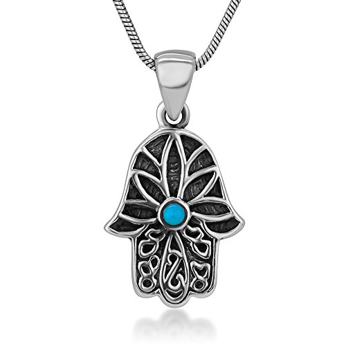 -. Title : 925 Oxidized Sterling Silver Hamsa Hand of Fatima Synthetic Turquoise Amulet Pendant Necklace, 18"