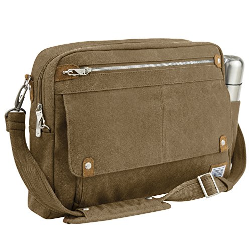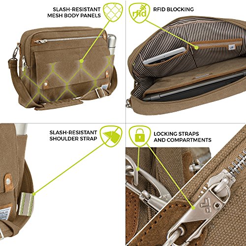 Studio : Travelon Publisher : Travelon Binding : Apparel Product Description Americana inspired with a modern twist this messenger works equally well for travel and everyday use. It features a roomy main compartment with padded sleeve to hold a laptop to 15.6. The zippered organizer compartment has 2 open top wall pockets, 2 pen loops and an two easy access, locking front compartments with organizer and zippered RFID blocking pocket. Anti-Theft features including slash-resistant construction, locking compartments, slash-resistant adjustable straps to keep you and your belongings protected. Crafted in a durable cotton canvas with rich suede trim, matte nickel hardware and classic pinstriped lining. The Travelon Anti-Theft Heritage Backpack will quickly become your favorite companion bag. 0