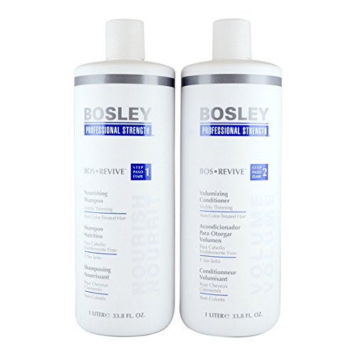 THIS IS A LITER SET BY BOSLEY BOS PROFESSIONAL STRENGTH THIS SET IS REVIVE FOR VISIBLY THINNING / NON COLOR TREATED HAIR BOSLEY PROFESSIONAL STRENGTH NOURISHING SHAMPOO 33.8 OZ A gentle rejuvenating, sulfate free cleanser that removes toxins such as D.H.T. (a primary cause of hair loss) from the scalp of visibly thinning hair. Reconditions the hair while rejuvenating the scalp with LifeXtend Complex Plus, while extending the longevity of color with ColorKeeper. It hydrates and nourishes while strengthening and fortifying the follicles and hair shaft for thicker, fuller looking hair It is sulfate free for gentle safer cleansing without potentially harmful ingredients Color Keeper extends longevity of hair color Bosley Revive Shampoo for Visibly Thinning Color Treated Hair. This gentle shampoo cleanses the scalp of DHT and environmental residue that can contribute to hair loss, creating an optimal scalp environment for healthier, thicker looking hair. Bosley Revive Nourishing Shampoo is designed to address the specific needs of people with thinning hair and has been proven in clinical studies to be an effective solution to the problem of weak and thinning hair. Infused with Bosley's unique ingredient blend, Bosley Revive Nourishing Shampoo will leave hair looking fuller, thicker and more resilient. BOSLEY PROFESSIONAL STRENGTH VOLUMIZING CONDITIONER 33.8 OZ Paraben free Volumizing conditioner. Infuses hair with vitality, volume while it smoothes and adds shine and a thicker appearance to visibly thinning hair. Contains Color Keeper Technology o extend the longevity of color. Apply daily to clean wet hair, leave 5 minutes and rinse. It hydrates and nourishes while strengthening and fortifying the follicles and hair shaft for thicker, fuller looking hair Plankton Extract hydrates and nourishes the hair and scalp Color Keeper extends longevity of hair color