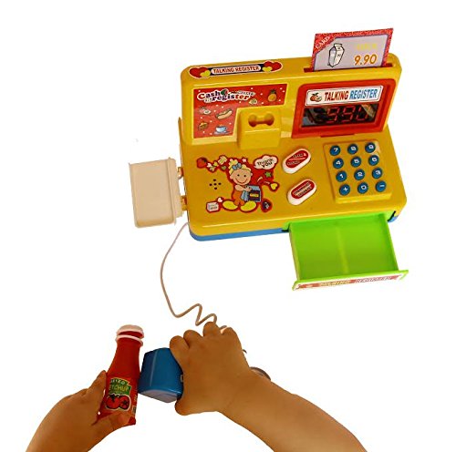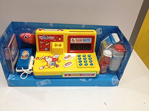 - Feature : Supermarket Cash Register Playset for Kids with Phone and Food. / Set includes 1 cash register with phone, pretend food and drink and product cards. / Highly educational; teaches your kids the concept of money in exchange for goods. / Cash register measures 8 x 5 inches. / A quality product manufactured by Dazzling Toys.