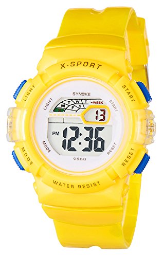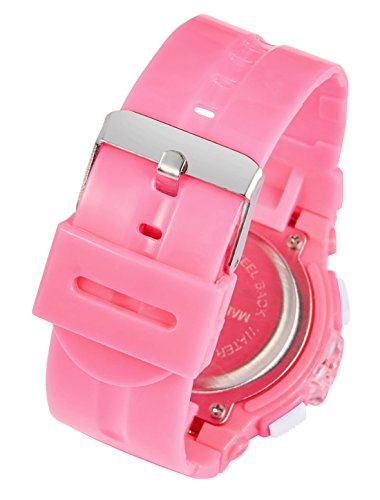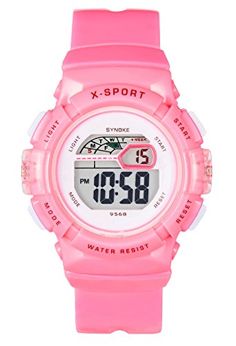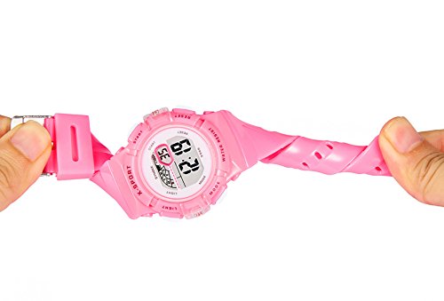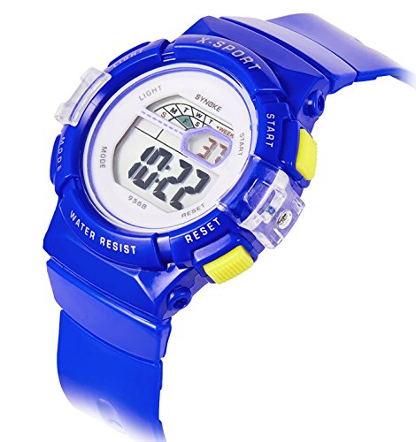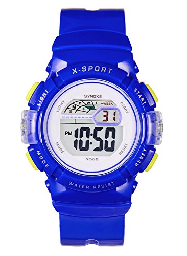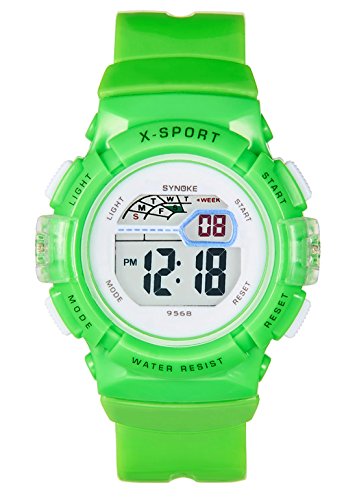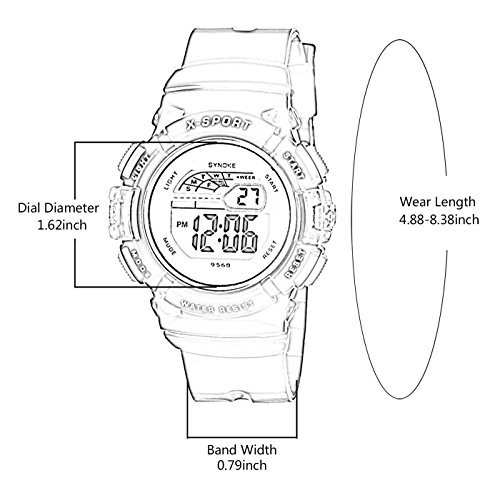 -. Feature : Dial Diameter:1.6inch,recommeding for 6-12 years old kids / Multifunctional sport Watch: alarm,stopwatch,LED back light mode;date/week/AM /PM/hour/minute/second display;12/24 hour format,satisfied your dear in all aspects / Material:acrylic dial,high quality PU plastic strap, harmless to your children's skin / Daily waterproof.Please DO NOT press any buttons underwater / Came with a lovely gift pouch,a great gift at Christmas,Holloween,New Year