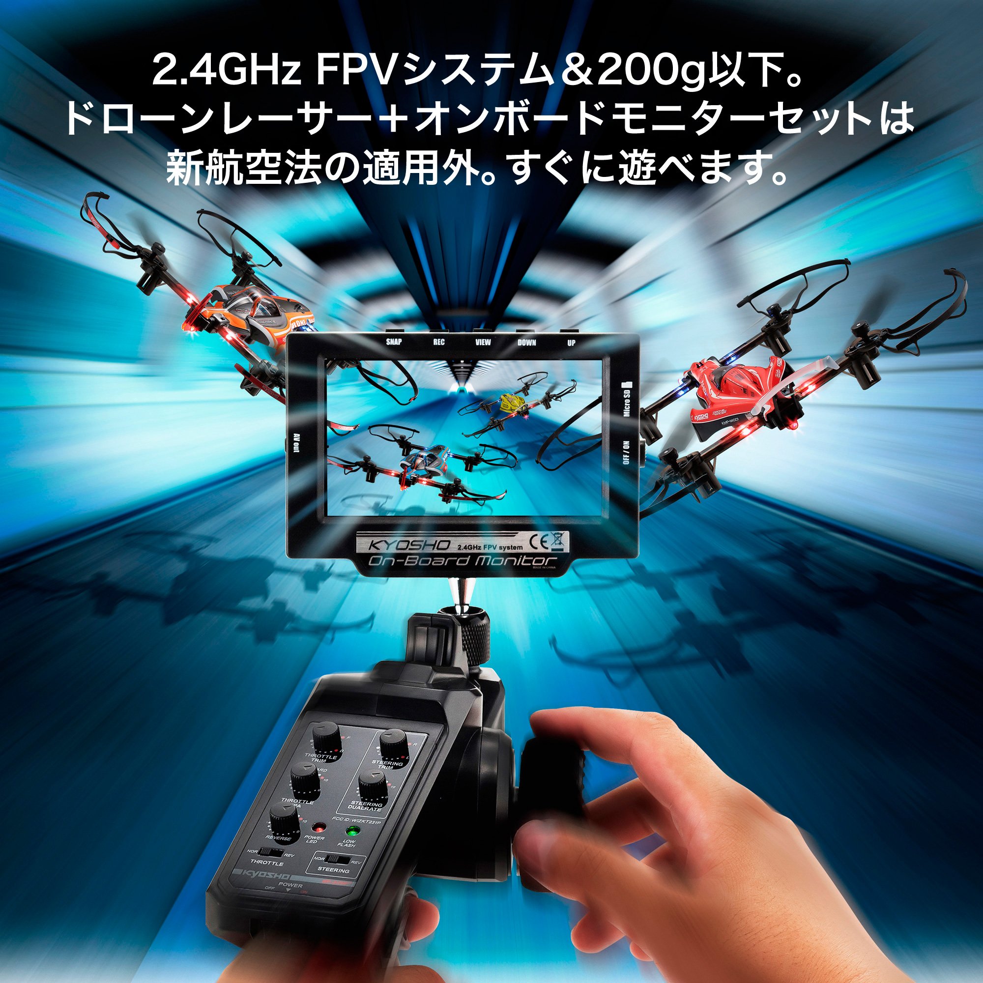 In the FPV system which is commonly used in racing drone etc., use of 5.8 GHz band which requires amateur radio qualification as the communication frequency band is mainstream, but KYOSHO onboard monitor does not require the above qualification