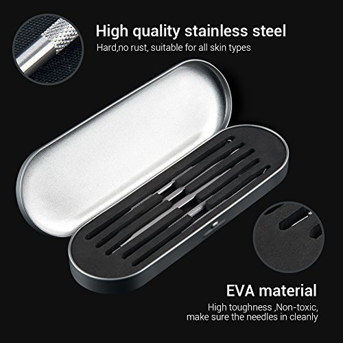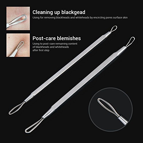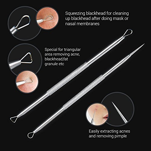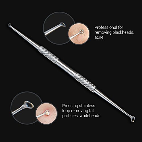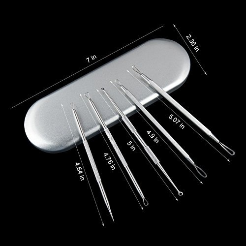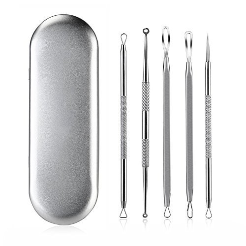 -. Feature : 5-in-1 MULTIFUNCTIONAL: The five pimple extractor tools are surgical grade and perfect for popping pimples, pinching zits, squeezing whitehead, removing acne and blackheads. / DOUBLE-ENDED TOOLS: Each end of the tools have unique oval rings of different shapes to help you handle pimples and acne of different sizes, each tool is designed to minimize skin contact and let skin heal naturally afterward / ERGONOMIC GRIP: Non-slip design for different sized finger and variety of holding positions, so you have easy control and precise handling for the entire process / TRAVEL READY: The remover tools come in elegant travel size case, anti-bacteria and easy to store, carry. / SKIN-FRIENDLY: Surgical grade stainless steel made, healthy enough to prevent bacteria build-up.