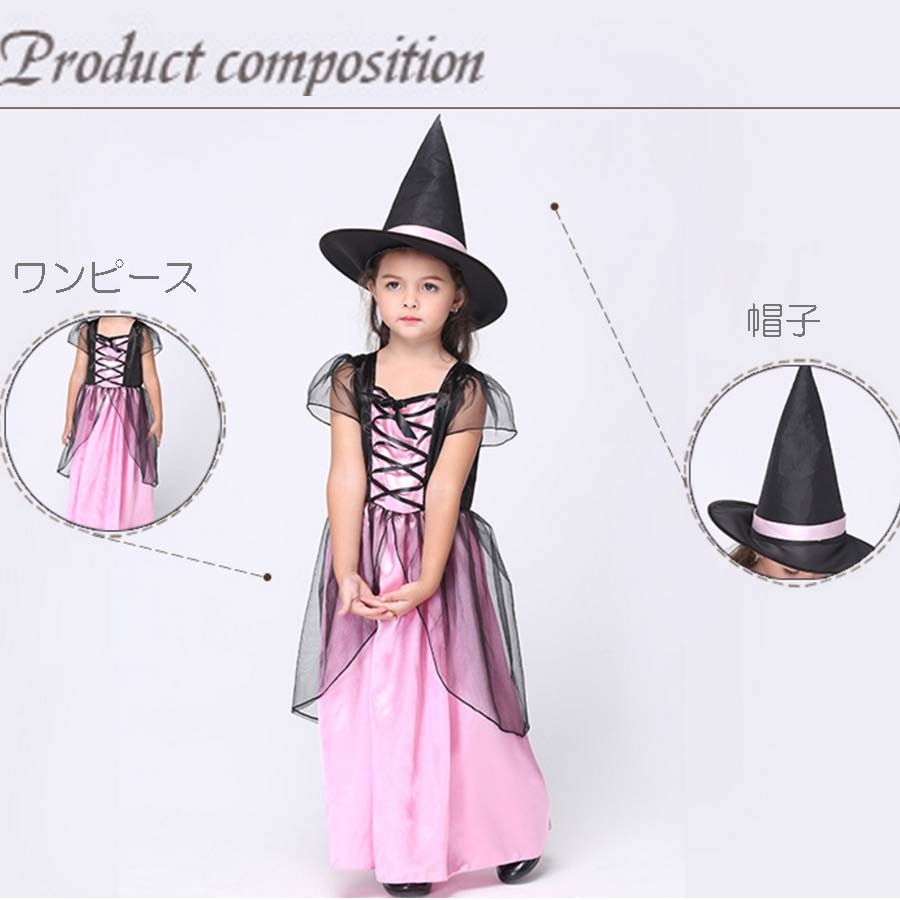 送料無料 2016新作 ハロウィン こども 魔女 ハロウィン衣装 子供 魔女 悪魔 ワンピース 女の子 衣装 子供用 仮装 ハロウィーン キッズ コスプレ コスチューム ハロウィン 衣装 子供 コスプレ 仮装 万聖節 激安 2点セット ダンス衣装 舞台 小魔女 ピンク