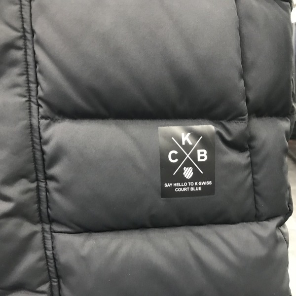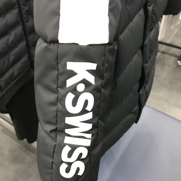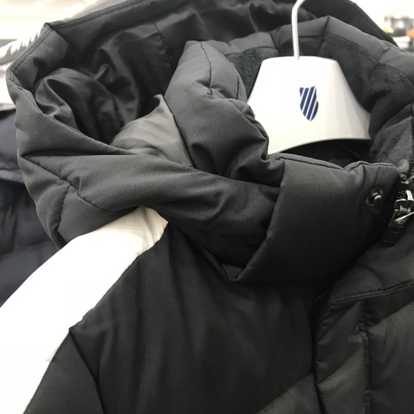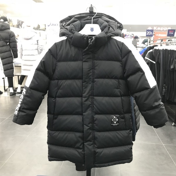다운프루프 기능이 있는 키즈 롱 벤치 다운.8020 덕다운을 사용하였고 어깨라인에 흰색선을 포인트로 사용