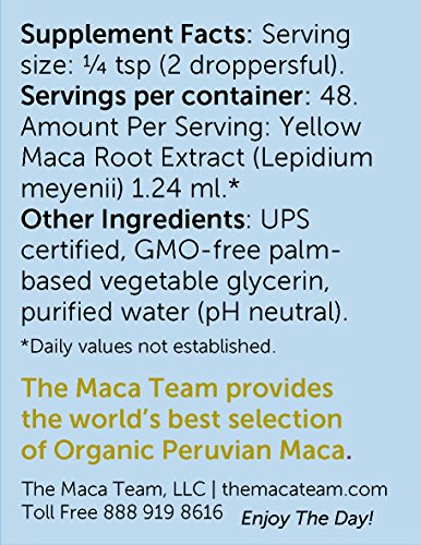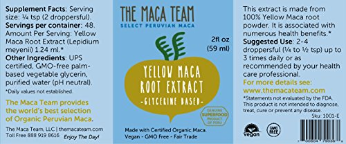 Our Maca Extract is made from our certified organic Peruvian grown Yellow Maca Powder traditionally grown and harvested on an organic farming co-op in a remote pristine part of the Peruvian Andes It is never heated above 106 degrees F in order to preserve nutrients at maximum levels. Yellow Maca has been the most researched of all 3 Maca colors. To date hundreds of studies, all available publicly in the Pubmed database, have found it to be useful for energy building, fertily, hormone balance, mental focus and more. Yellow Maca is indeed a nutritional powerhouse, containing nearly all essential amino acids and free fatty acids, significant levels of vitamins A, B1, B2, B3, and C, minerals iron, magnesium, zinc and calcium, a high concentration of bio-available protein and nutrients unique to Maca called macaenes and macamides. Maca is also an "adaptogen," or rare form of plant that is thought to raise the overall life force energy of those who consume it. The major benefits of Maca extracts over powder or capsules include: freshness and longer shelf life, better bioavailibililty of nutrients, ease of use and faster absorption results. The Maca Team, LLC is dedicated to preserving and sharing high quality Peruvian grown Maca with the world. As a family run company of Maca specialists, we're here to bring you the most Maca has to offer. We are proud to source and sell the best selection of high quality Peruvian Maca in the world. All of our products are always organically grown, fairly traded, GMO-free, fresh and potent. We sell 8 different kinds of certified organic Maca, raw and gelatinized (pre-cooked), in a variety of sizes, in vegan capsules and extracts. Please see our seller profile for more details and links to our products. Thank you for considering The Maca Team. Enjoy your day!Feature