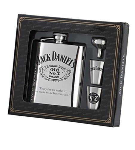 Studio : Jack Daniels Licenced barware Publisher : Jack Daniels Licenced barware Binding : Kitchen Product Description This classic gift set includes a hip flask, two stainless steel shot glasses, and a flask funnel. The flask has a brightly polished permanent finish. The main subject of the flask is the Jack Daniel’s Swing logo and Old No. 7 with Cartouche logo appearing in the center. The famous Jack Daniel’s quote, “Every day we make it, we make it the best we can,” is at the bottom of the flask. Twist-off stainless steel cap is permanently attached to the flask for loss prevention. The shot glasses are decorated with the Jack Daniel's Swing logo on one side and the Old No. 7 button logo on the other. The flask funnel is engraved with "Jack Daniel's," and a stylish black gift box completes the item. 0
