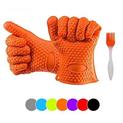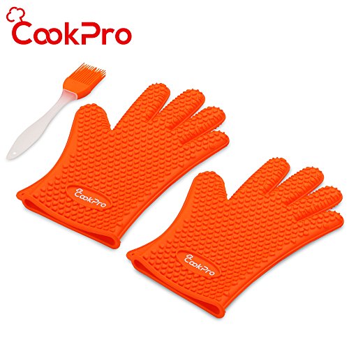 CookPro Silicone Ov for BBQ Grill, Baking, Potholder and Kitchen Use; Extra Thick (190g Per Glove) Heat Resistant, Non-slip, Water Proof and Dishwasher Safe-with BBQ brush- orange