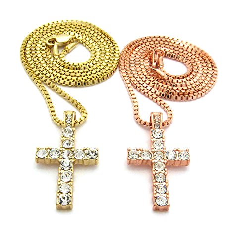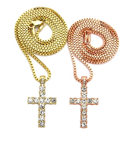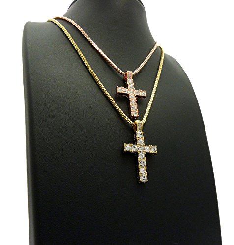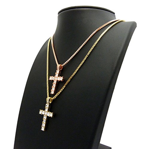 -. Feature : Iced Out Double Cross Pendant 2mm 24",30" Box Chain 2 Necklace Set in Rose Gold, Gold Tone / Size of Pendant : 0.8" x 1.5" / Chain: Rose Gold Box Chain - 2mm 24", Gold Box Chain - 2mm 30" / Fashion Costume Jewelry / Imitation Gold, Rose Gold Color Plated