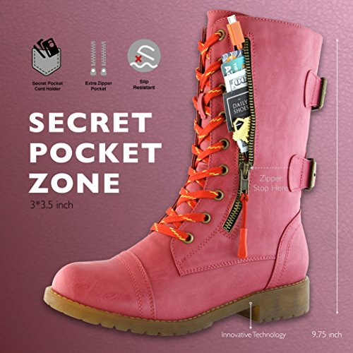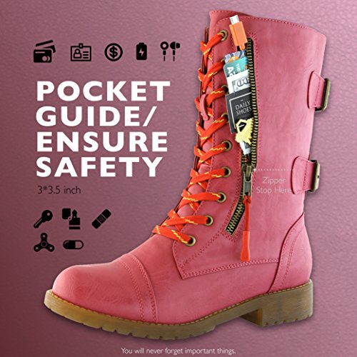 Binding : Apparel Product Description RUGGEDLY CRAFTED With the DailyShoes Women's Military Combat Boots with Pocket, you can easily walk on all types of terrains. The slip-resistant rubber sole has a special traction grip that will keep you on your feet on slippery floors, icy sidewalks, and loose gravel. The boots are constructed out of heavy-duty vegan leather that resists wear and tear, making these boots perfect for work or play TRAVEL LIGHT WITH EASE 3-inch by 3.5-inch zippered storage pocket gives you a place to stow your Cash or Credit cards Pocket Knife Event Tickets, Vouchers, Coupons Keys and other Small Essentials RUGGEDLY CRAFTED With the DailyShoes Women's Military Combat Boots with Pocket, you can easily walk on all types of terrains. The slip-resistant rubber sole has a special traction grip that will keep you on your feet on slippery floors, icy sidewalks, and loose gravel. The boots are constructed out of heavy-duty vegan leather that resists wear and tear, making these boots perfect for work or play. COMFORT ASSURED Padded insole cushions your foot as you walk. lace-up front allow you to adjust the fit for optimal support PERFECTLY SIZED 9.75-inch shaft and 13-inch circumference to comfortably fit women of a variety of sizes Store all your favorites on-the-go anywhere you like. GO OUT FOR AN ADVENTURE TODAY Go for a hike with our combat boots, the mountains are calling. Splish splash in muddy puddle while having your hands free 0