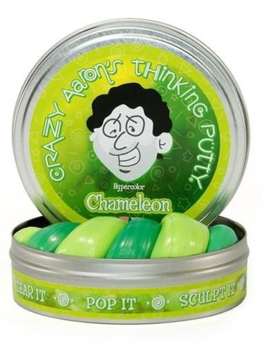 -. Binding : Toy -. Brand : Crazy Aaron's Thinking Putty -. EAN : 0688943131380 -. Feature : HAMELEON putty is part of Crazy Aaron's Hypercolor collection. / Hypercolor is Thermochromic - warm it with your hands or a warm coffee mug to reveal a hot new yellow color. / Allow it to cool off or stick it in the fridge to restore it to its original cool green color. This LARGE size 4" tin contains 3.2oz of putty. -. IsAdultProduct : 0 -. Label : Crazy Aaron's Thinking PUTTY -. Manufacturer : Crazy Aaron's Thinking PUTTY -. ProductGroup : Toy -. ProductTypeName : TOYS_AND_GAMES -. Publisher : Crazy Aaron's Thinking PUTTY -. Studio : Crazy Aaron's Thinking PUTTY -. Title : CHAMELEON Green Hypercolor LARGE 4" Tin Crazy Aaron's Thinking PUTTY Fidget toy -. UPC : 688943131380