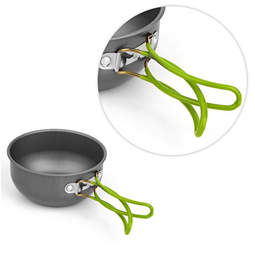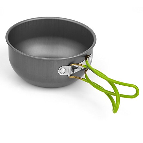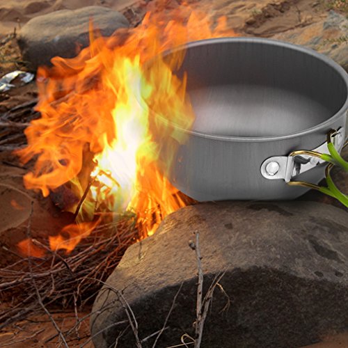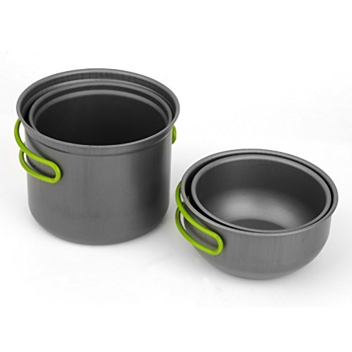 This outdoor cooking set is designed for two or three people.The pots and lids are made of anodised aluminum, which makes it solid, light and easy to clean.