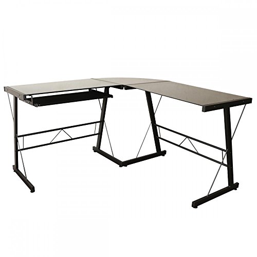-. Feature : Ideal for business or personal use Slide out keyboard tray(can be on different side at your convenience / Stylish L-Shaped Corner Computer Desk provides ample space for work / Material:5mm tempered glass with plastic cup, steel tube with powder coating / Overall dimensions:51" Lx 51"Wx 30"H / Sturdy frame with architectural design supporting all office necessities