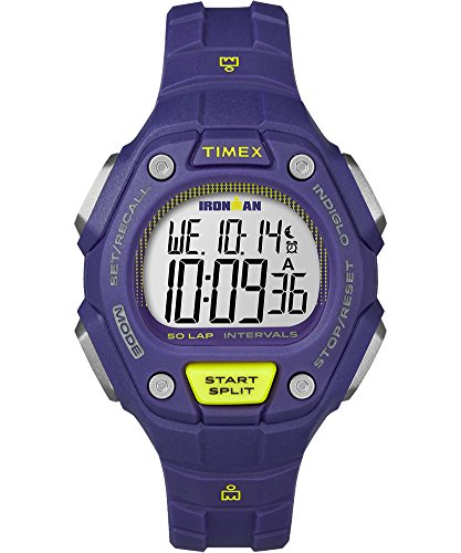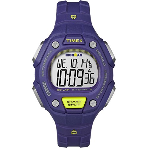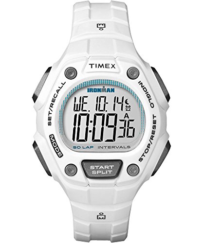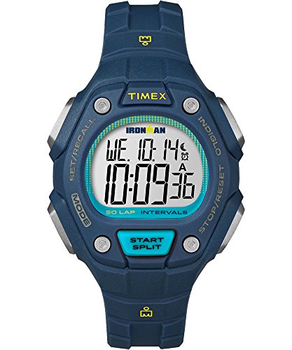 Studio : Timex Publisher : Timex Binding : Misc. Product Description The undisputed favorite in sport watches, the Timex Ironman® Classic 50 Midsize Watch crosses nearly every finish line in the world. Built to be lightweight and sealed for water resistance, the iconic five-button design gives you direct access to run timers, interval workout modes, workout memory, alarms and of course Timex INDIGLO® night-light.Three daily, weekday, weekend or weekly alarm with five minute backup..Two time zones settings for travel or daylight savings..Dependable water resistance to 100 meters..Easy to view in low light conditions with Indiglo® night-light.. 0